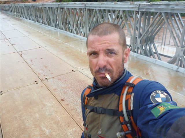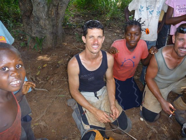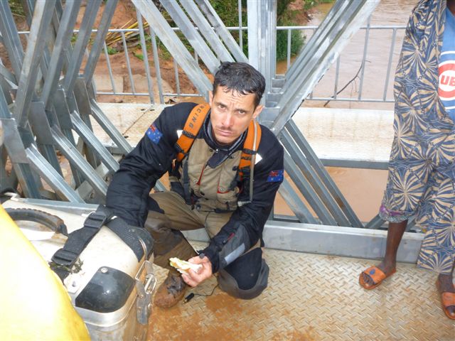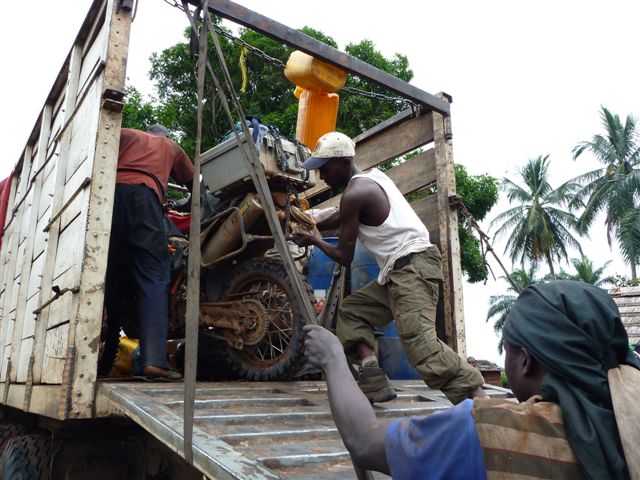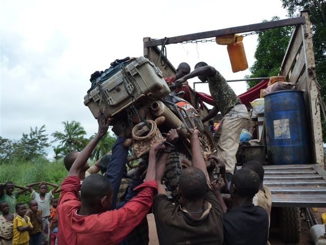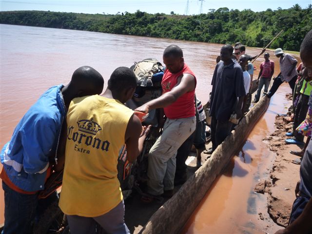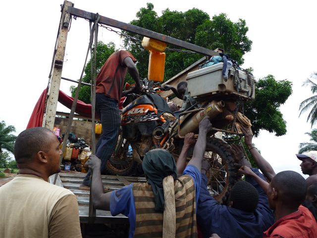 Ali and the guys lifting the bikes into a canoe